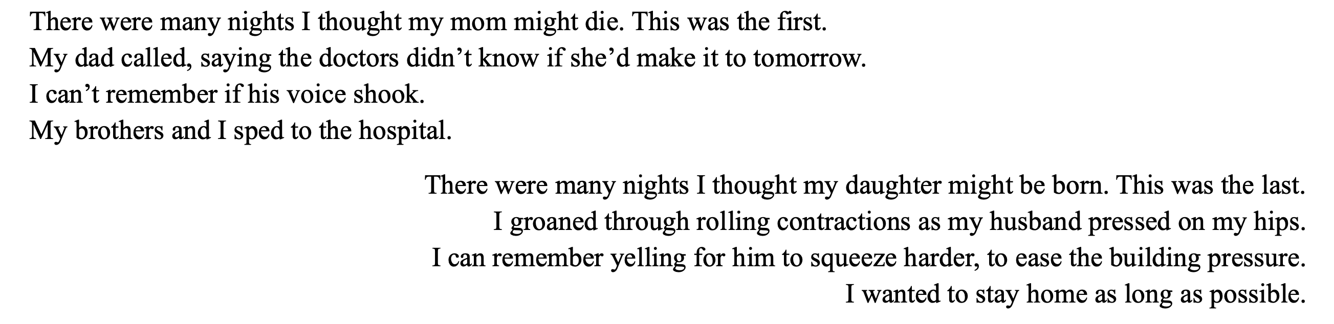 The story of what I thought would be my last night with my mom, mirrored in the story of welcoming my baby girl.