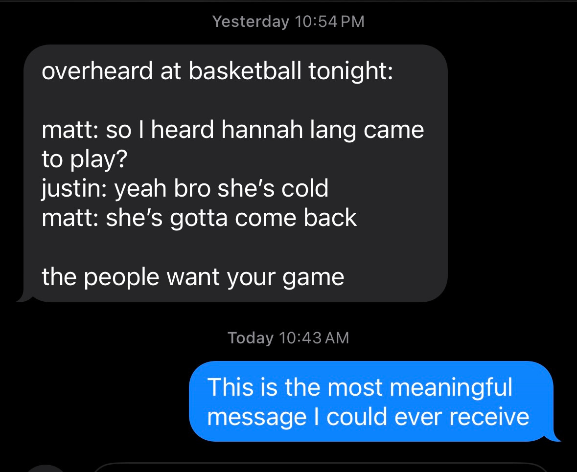 If you feel so moved to throw me a bone on my birthday week, it would mean a lot if you commented, shared, or liked a piece below that connects with you. (But know that no comment will mean as much as this text I received this summer, reviewing my debut at the church “hoop group”:)